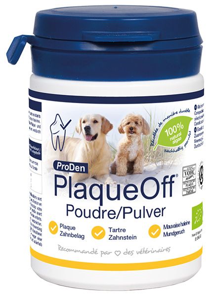 Le ProDen PlaqueOff 180 g est un complément alimentaire naturel, recommandé par les vétérinaires, conçu pour améliorer l’hygiène bucco-dentaire des chiens.