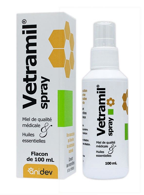 Vetramil Spray est une solution cutanée pratique à appliquer, formulée à base de miel de qualité médicale et d’huiles essentielles sélectionnées.