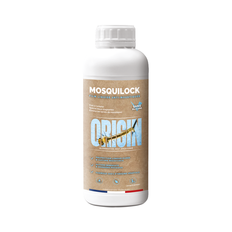 L'ORIGIN Mosquilock est une solution inédite et innovante pour lutter contre le développement des moustiques par action physique. Ce film liquide, formulé à 100% d'origine végétale et sans silicone, s'étale à la surface des eaux stagnantes pour empêcher les larves de respirer. Efficace sur tous les stades larvaires (L1 à L4), il garantit une éradication complète sans utiliser de substances biocides actives.