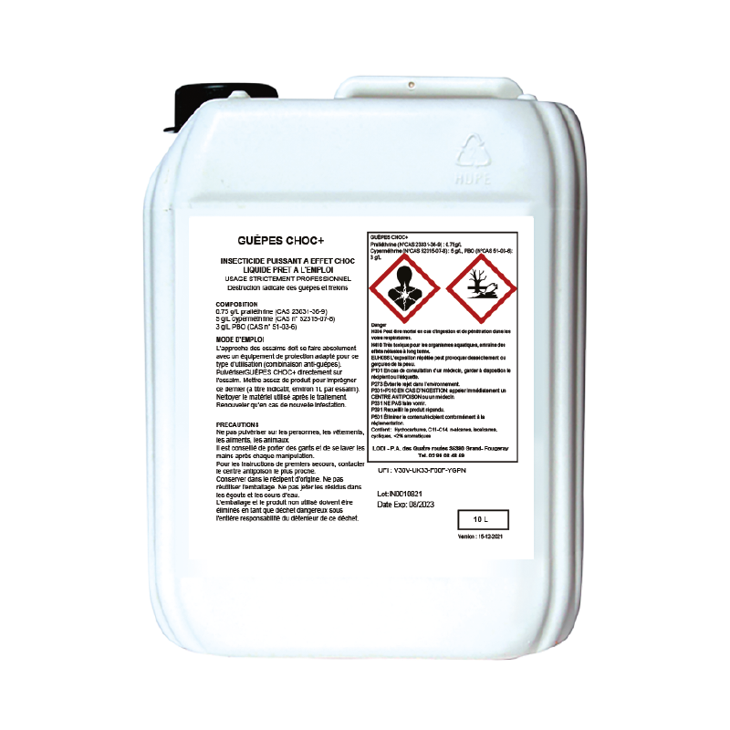 La formulation experte de Guêpes Choc + repose sur la synergie de deux matières actives puissantes. La Pralléthrine assure une paralysie instantanée des insectes dès le contact, tandis que la Cyperméthrine offre une barrière résiduelle efficace dans le temps.