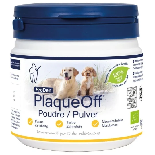 Le ProDen PlaqueOff 420 g est un complément alimentaire naturel spécialement conçu pour améliorer l’hygiène bucco-dentaire des chiens.