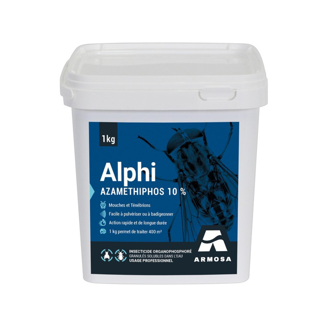 Alphi Mouches est un insecticide organophosphoré de qualité professionnelle conçu pour le contrôle radical des infestations dans les bâtiments d'élevage. Formulé à base de 10% d'Azaméthiphos, il offre une action rapide et une protection de longue durée contre les mouches et les ténébrions. Un seau de 1 kg permet de protéger efficacement une surface au sol allant jusqu'à 400 m².