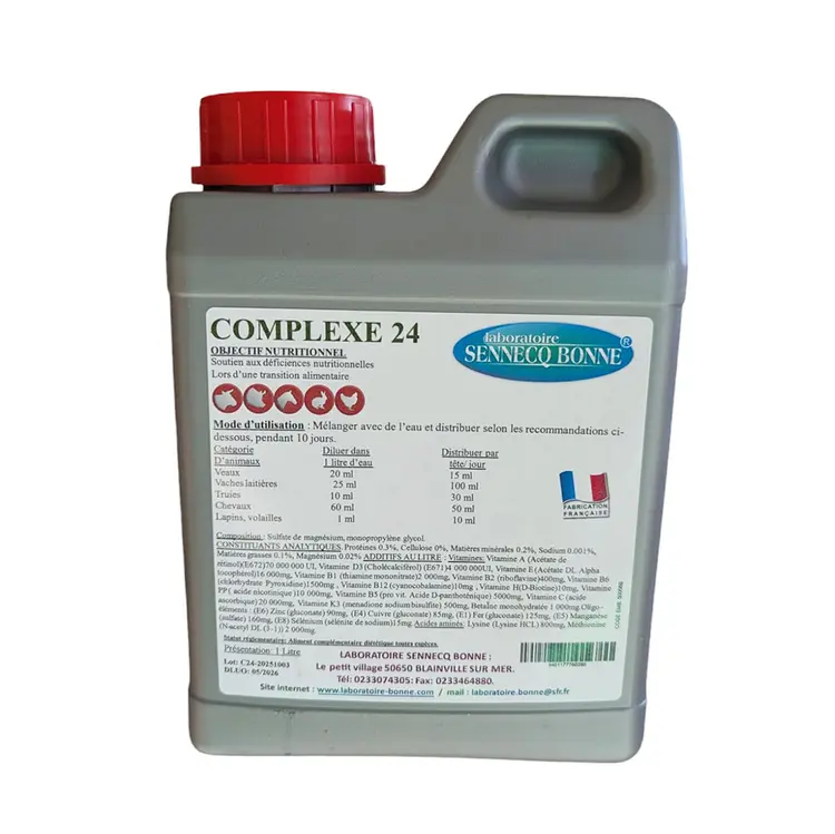 COMPLEXE 24 du Laboratoire Sennelco Bonne est une solution vitaminée liquide complète, conçue pour stimuler la vitalité, la croissance et la résistance des animaux.