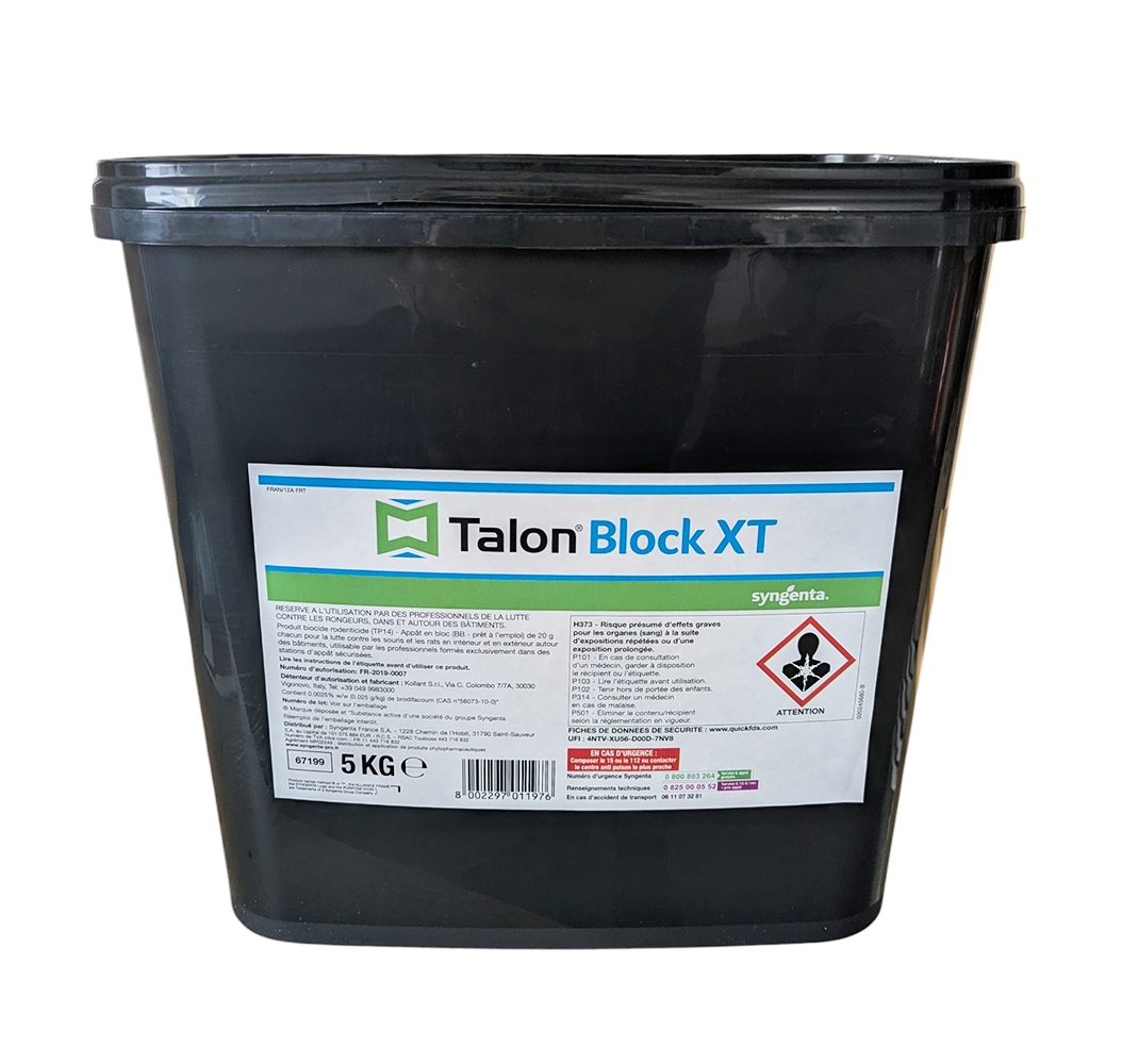 Quand les raticides classiques échouent, le Talon Block XT prend le relais. Développé par Syngenta, ce bloc extrudé contient du Brodifacoum, une molécule de 2ème génération capable d'éliminer un rongeur avec une dose infime. C'est l'arme absolue pour les professionnels de la dératisation.