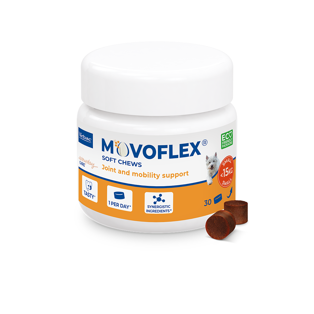 Movoflex S Chien (<15 kg) est un complément alimentaire vétérinaire formulé par Virbac pour soutenir la mobilité articulaire et le confort des petits chiens.