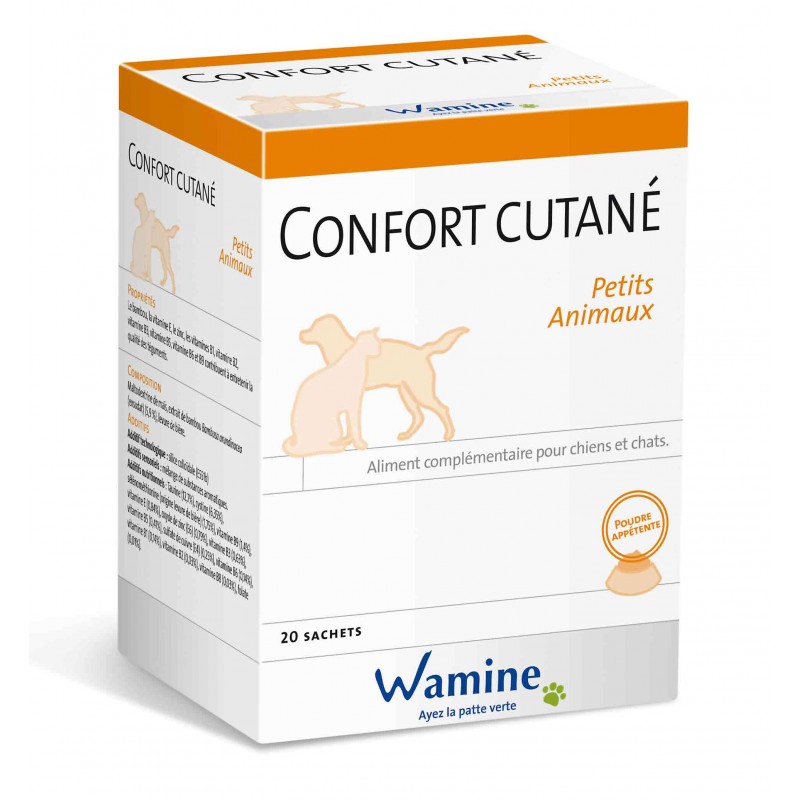 Wamine Confort Cutané est un complément en poudre pour chiens et chats, formulé pour soutenir la peau sensible, réduire les inconforts cutanés et apaiser les démangeaisons grâce à des extraits naturels.