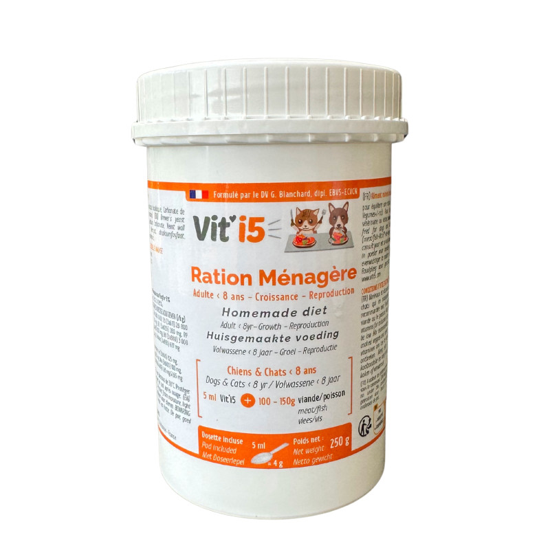 Le Vit’i5 Orange 250 g est idéal pour les propriétaires adeptes de la ration ménagère crue ou BARF souhaitant garantir un équilibre nutritionnel complet.