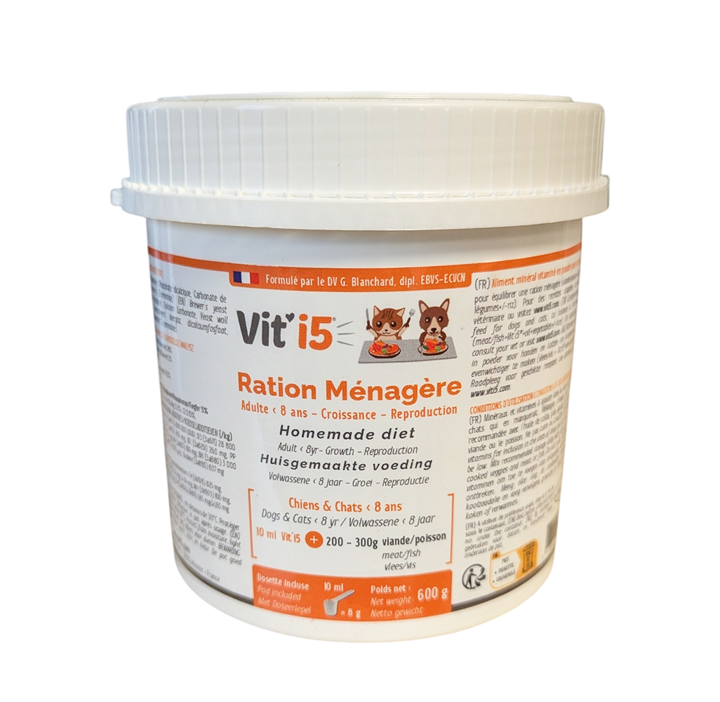 Le Vit’i5 Orange 600 g est recommandé pour les régimes ménagers crus ou BARF afin de garantir un apport complet en calcium et phosphore.