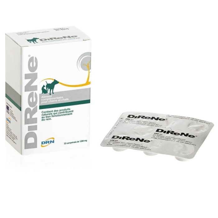 Direne comprimés est un aliment complémentaire vétérinaire conçu pour soutenir la fonction rénale chez les chiens et les chats, notamment en cas de reins fragiles, d’insuffisance rénale chronique (IRC), d’augmentation de l’urée ou de la créatinine, ou de vieillissement rénal chez les animaux seniors.