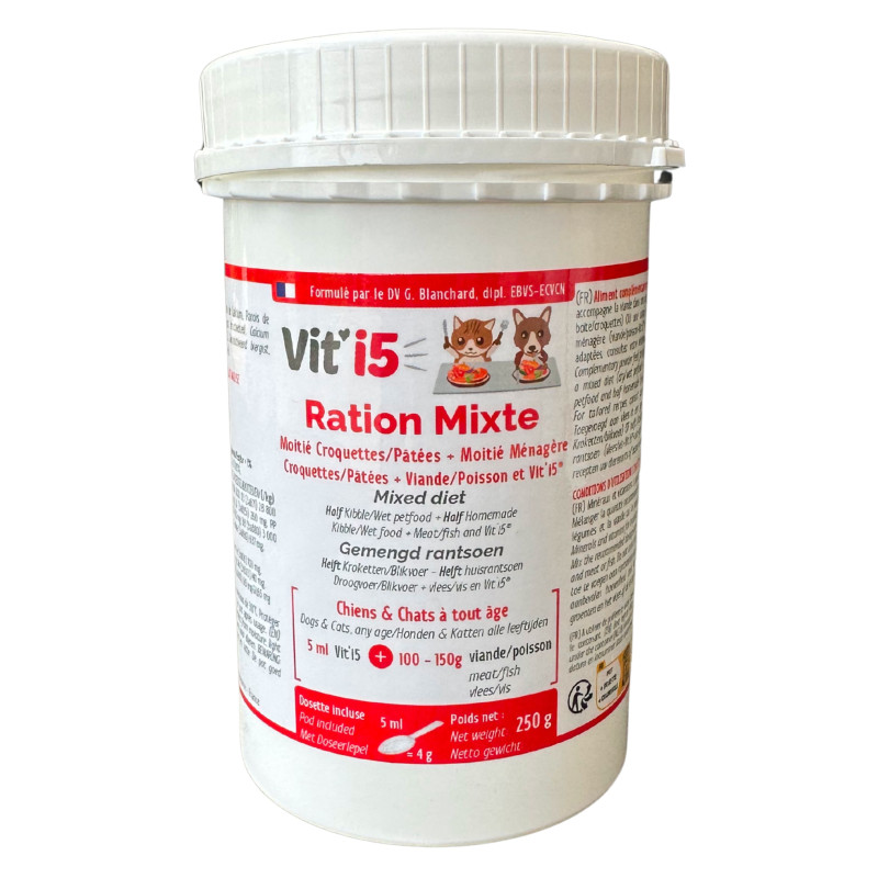 Le Vit’i5 Rouge Osalia est un complément minéral et vitaminé conçu par des vétérinaires nutritionnistes pour équilibrer les rations mixtes (ménagère + industrielle) des chiens et chats adultes.