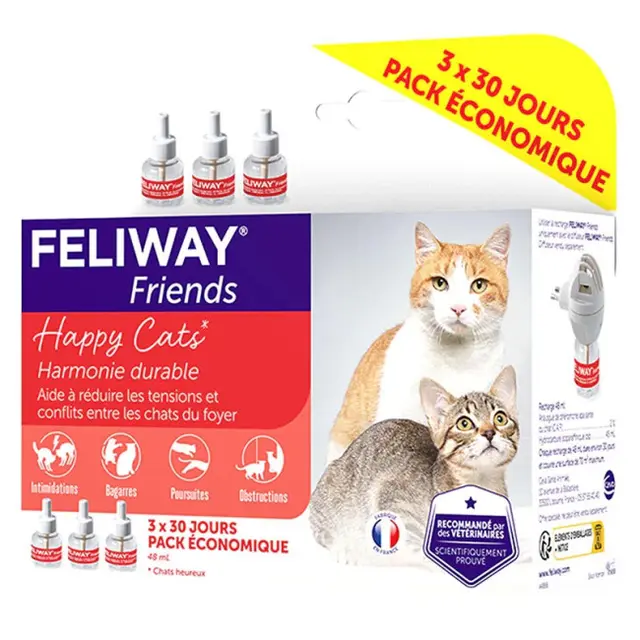 Pack recharges Feliway Friends, 90 jours d’apaisement pour réduire tensions, bagarres et rivalités entre chats du foyer.