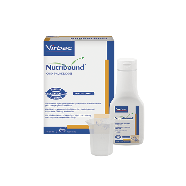 Pour un chien affaibli ou déshydraté, commencez par administrer Nutribound à petites doses régulières afin de favoriser la tolérance digestive.