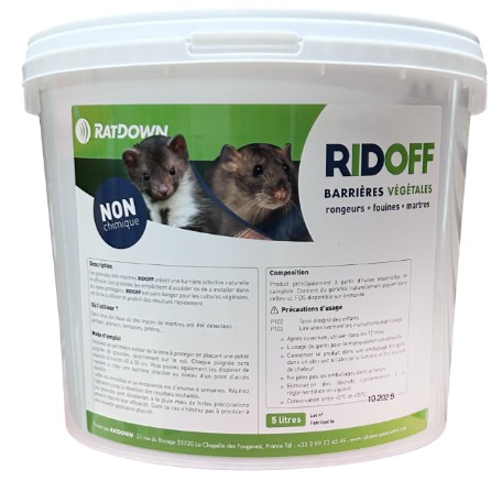 RIDOFF est une barrière végétale innovante et non chimique conçue pour repousser efficacement les rongeurs (rats, souris) ainsi que les fouines et les martres. Formulés à partir d'huile essentielle de camphre, ces granules créent une barrière olfactive naturelle qui empêche l'accès aux zones protégées sans danger pour les cultures.