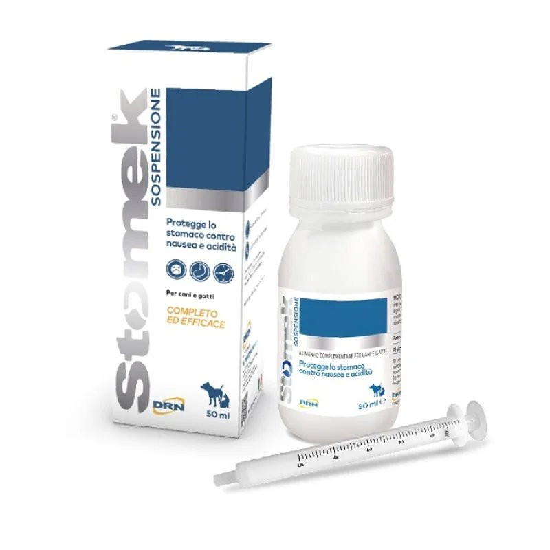 Stomek Suspension de DRN est un complément diététique liquide spécialement conçu pour protéger la muqueuse gastrique, réduire l’acidité et favoriser une digestion harmonieuse chez le chien.