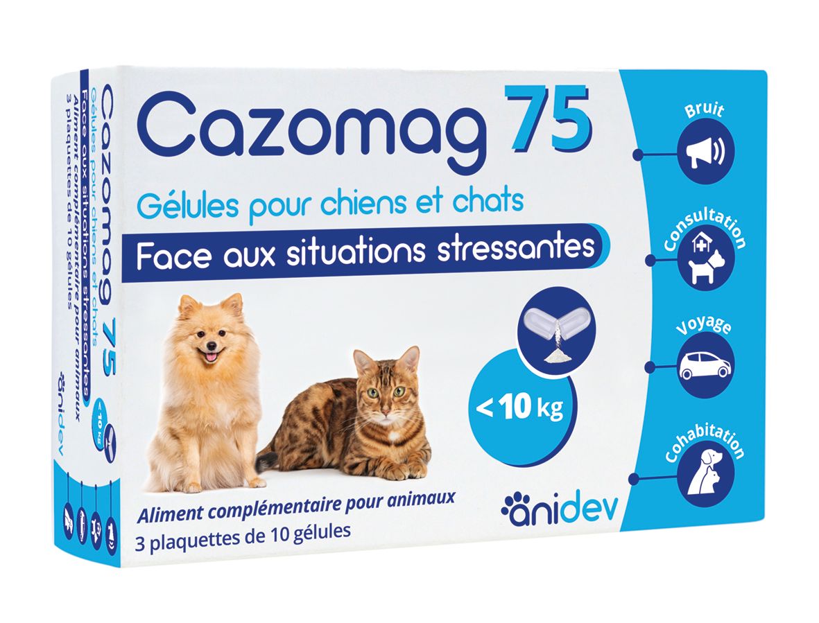 Cazomag 75 aide à apaiser chiens et chats de moins de 10 kg face aux situations stressantes : bruit, voyage, consultation vétérinaire ou cohabitation difficile.