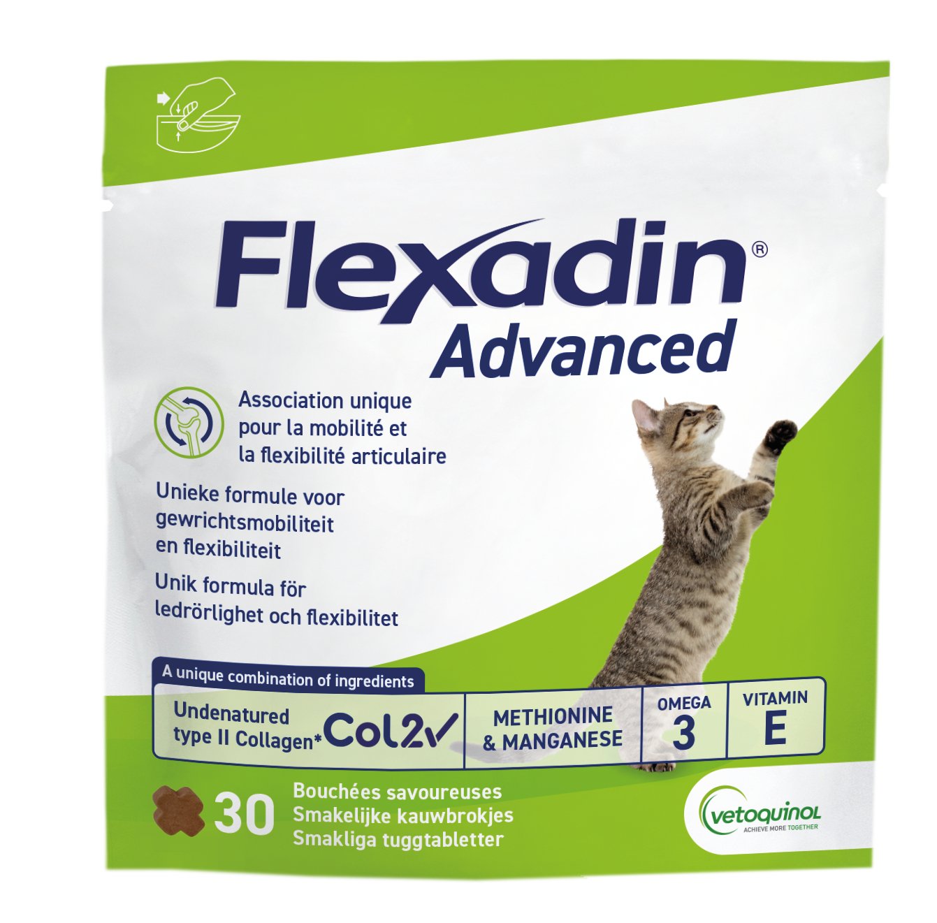 Flexadin Advanced Chat est un aliment complémentaire révolutionnaire pour le soutien des articulations des félins. Sa formule unique combine du Collagène UC-II®, des Oméga 3, de la Vitamine E ainsi que de la Méthionine et du Manganèse. Présenté sous forme de bouchées savoureuses, il aide votre chat à retrouver sa souplesse et son envie de sauter, avec une prise simple d'une seule bouchée par jour.