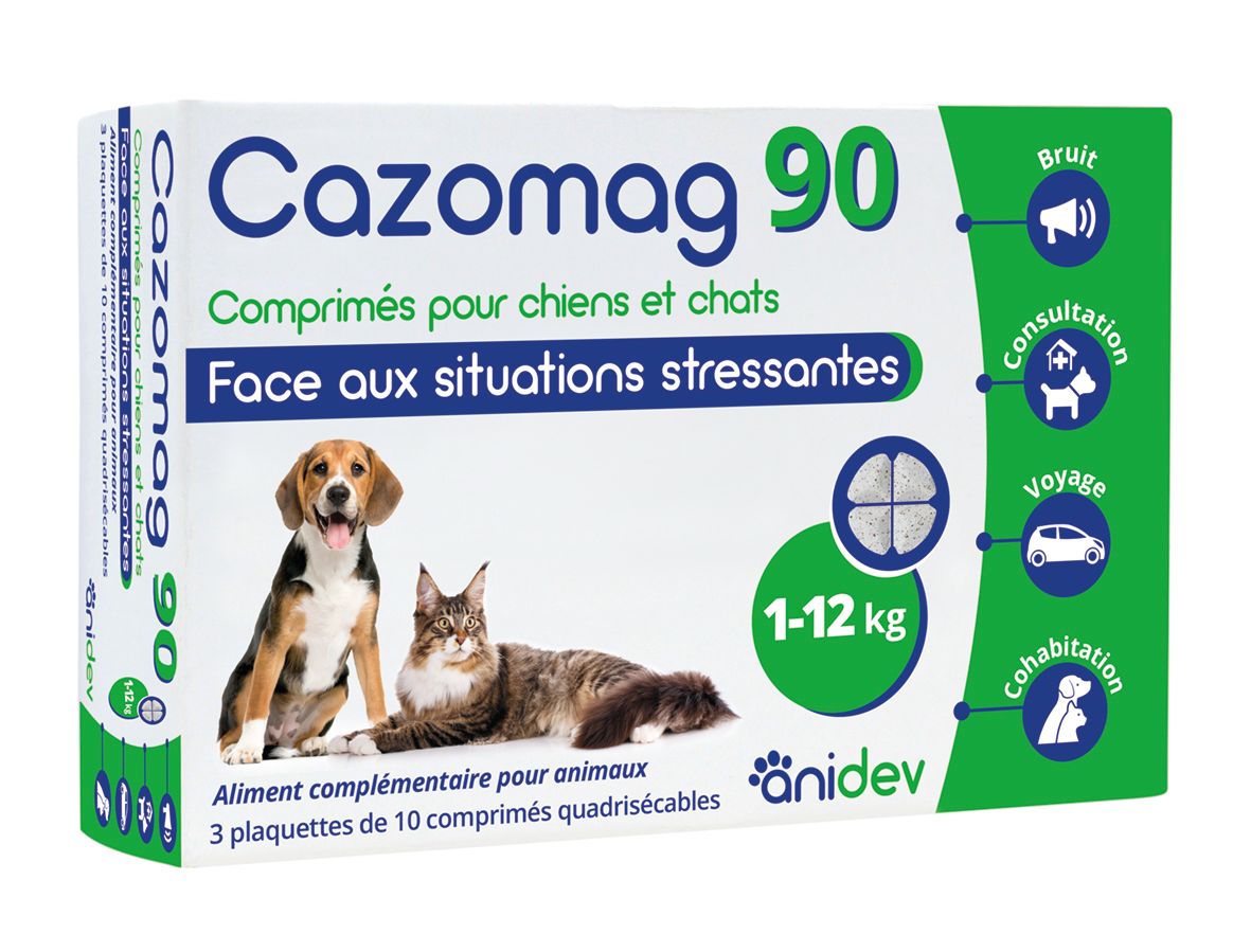 Le Cazomag 90 est un aliment complémentaire formulé pour apaiser chiens et chats de 1 à 12 kg lors de situations stressantes ponctuelles ou prolongées.