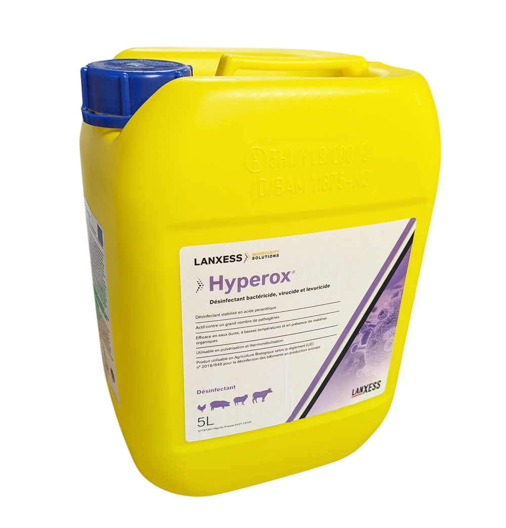 Hyperox est un désinfectant puissant à large spectre à base d'acide péracétique stabilisé (N° CAS 79-21-0). Homologué TP3 (N° 9700271), il garantit une hygiène parfaite des logements d'élevage, du matériel et des transports. Sa formule unique est efficace même à basses températures et ne laisse aucun résidu après application. Bactéricide, Virucide et Fongicide. Formulation recommandée en élevage label, utilisable en agriculture biologique.