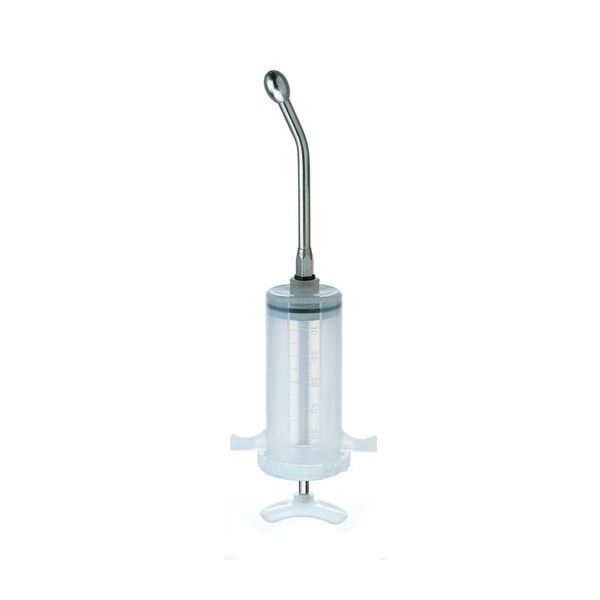 Administrez vos traitements liquides en toute sécurité avec cette seringue drogueuse de 50 ml. Équipée d'une canule métallique courbée à embout olive atraumatique et d'une molette de réglage à vis, elle garantit un dosage précis et sans blessure. L'outil indispensable pour les éleveurs et les soins vétérinaires.