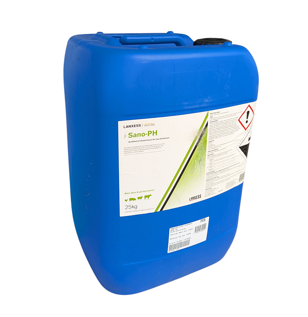SANO-PH est un acidifiant liquide haute performance pour l'eau de boisson, formulé sur une association synergique de 3 acides organiques et de minéraux. Sa force majeure réside dans sa capacité à abaisser le pH de l'eau quelle que soit sa dureté (TH). Il assainit l'eau, inhibe le développement bactérien dans le tube digestif et améliore les performances de croissance et l'immunité des animaux.