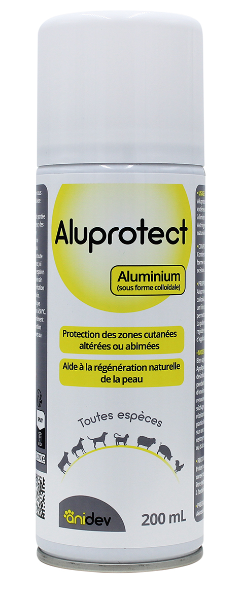 Aluprotect est un spray barrière à base d'aluminium colloïdal conçu pour protéger les plaies superficielles et les zones cutanées abîmées chez toutes les espèces (bétail, chevaux, animaux de compagnie). En séchant, il forme un film métallique souple qui agit comme un pansement liquide : il isole la plaie des bactéries, de l'humidité et des saletés, tout en laissant la peau respirer pour favoriser une régénération naturelle rapide.
