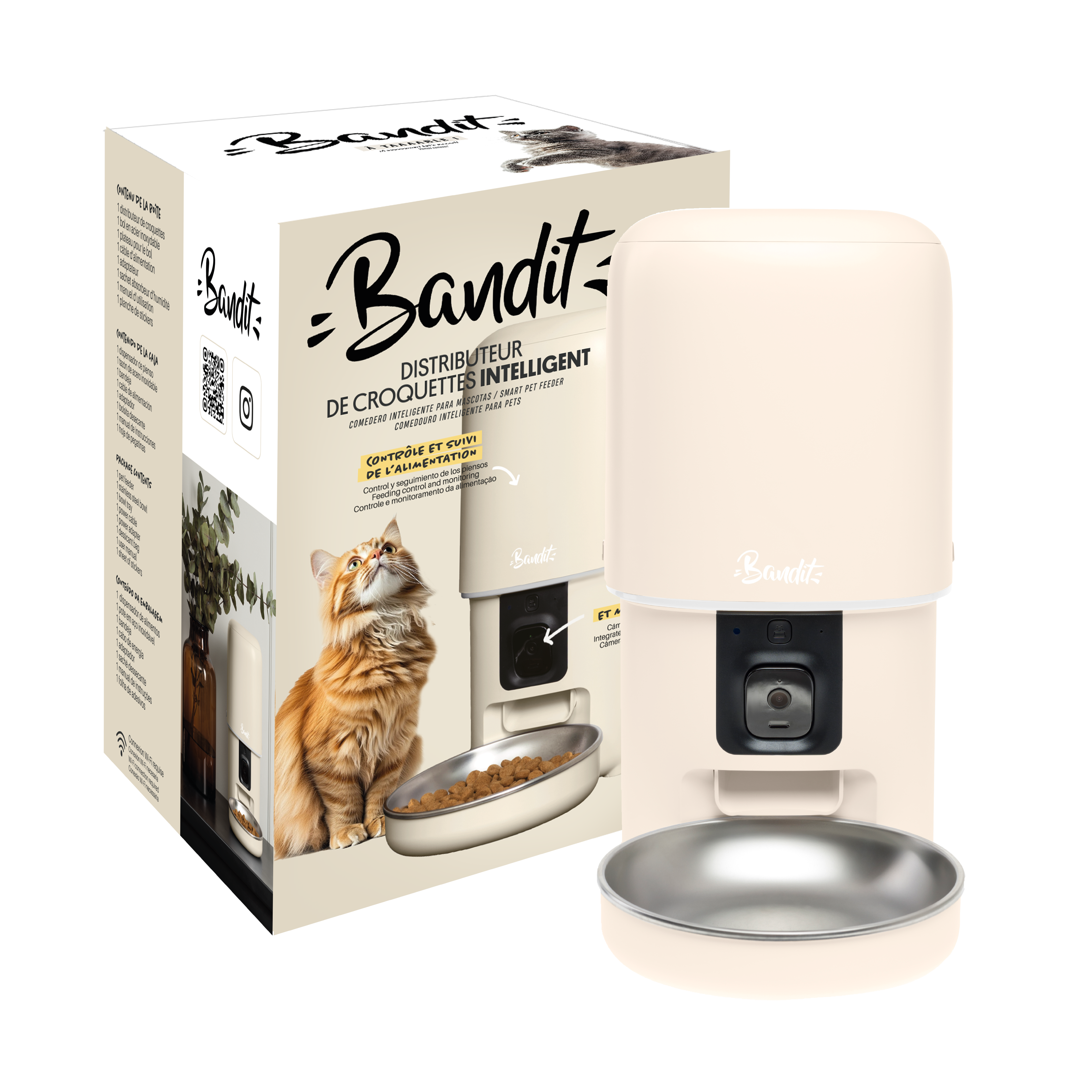 Présentation : 1 Distributeur Bandit Intelligent (Modèle Crème) + 1 Bol en Acier Inoxydable amovible + 1 Câble d'alimentation + Adaptateur secteur.