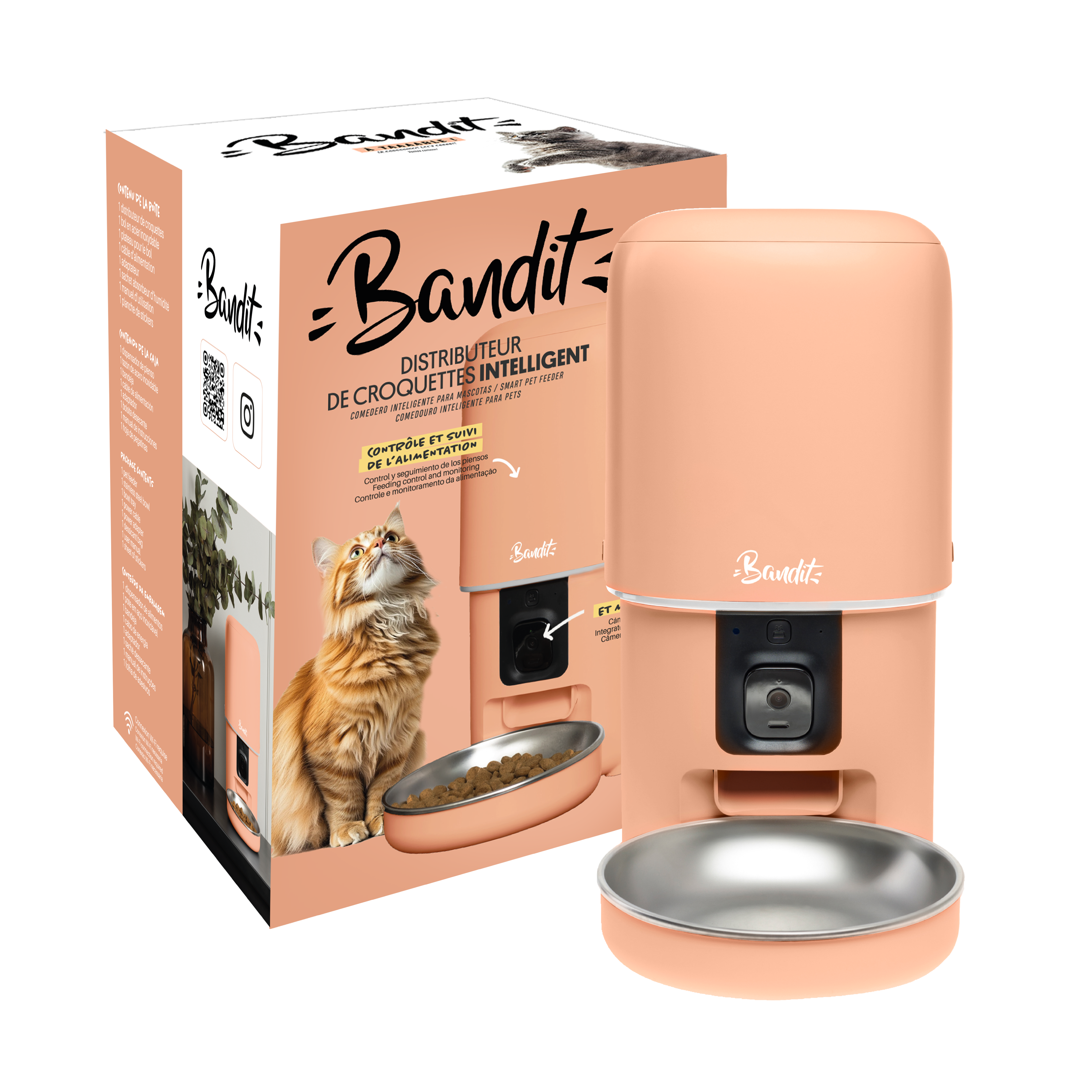 Le Distributeur de Croquettes Intelligent Bandit (Coloris Pêche) est une solution high-tech tout-en-un pour la gestion des repas de votre chat ou petit chien. Connecté en Wi-Fi, il vous permet de programmer des distributions automatiques, de surveiller votre animal grâce à sa caméra HD infrarouge et de lui parler via l'application mobile. Son design moderne couleur pêche et son système de stockage hermétique en font l'allié idéal pour la santé de votre animal et votre tranquillité d'esprit.