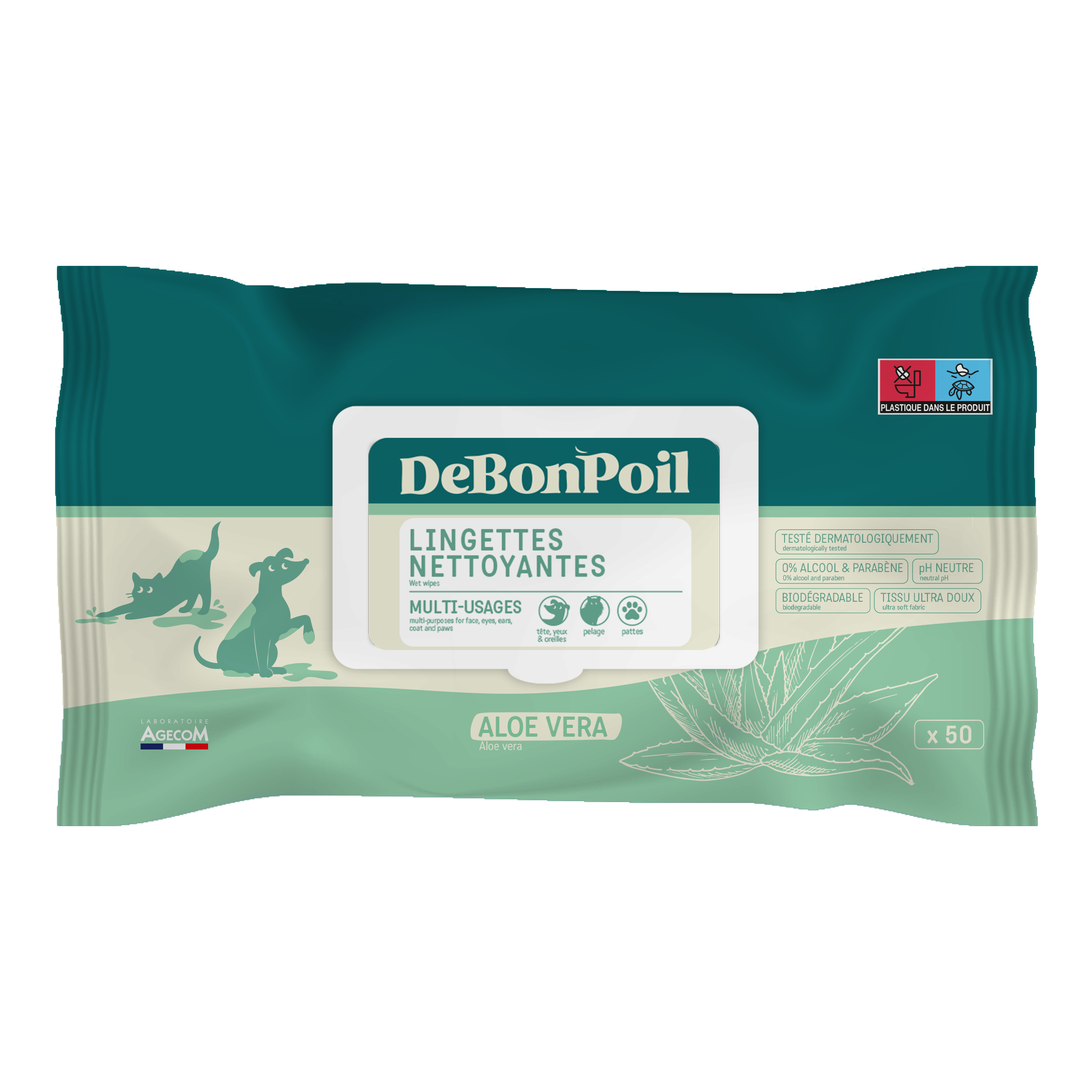 Alliez hygiène et soin avec les Lingettes Nettoyantes DeBonPoil à l'Aloe Vera. Ce paquet de 50 lingettes multi-usages permet de nettoyer votre chien ou chat tout en hydratant sa peau grâce aux vertus naturelles de l'Aloe Vera. Une solution douce pour un pelage frais et des coussinets apaisés, sans rinçage.