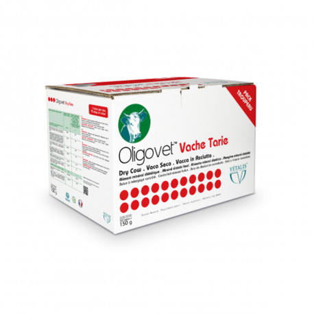 Oligovet Vache Tarie est un aliment minéral diététique sous forme de bolus à relargage contrôlé. Conditionné en "Pack Troupeau" de 50 bolus de 150g, il est spécifiquement formulé pour les vaches laitières de plus de 400 kg.
