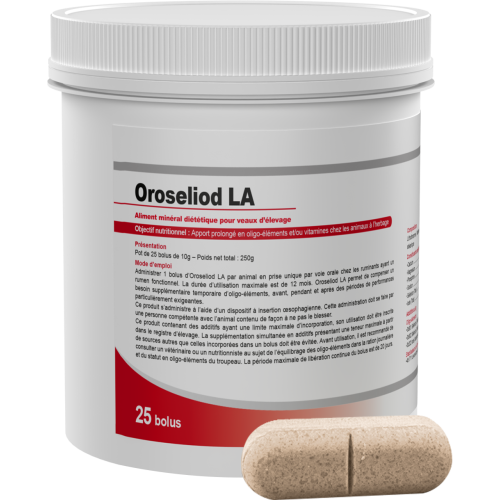 OROSELIOD LA est un aliment minéral diététique sous forme de mini-bolus à libération prolongée. Spécialement formulé pour les veaux, il apporte en une seule prise l'Iode et le Sélénium nécessaires pour soutenir le métabolisme, la croissance et les défenses immunitaires pendant 3 semaines (20 jours).