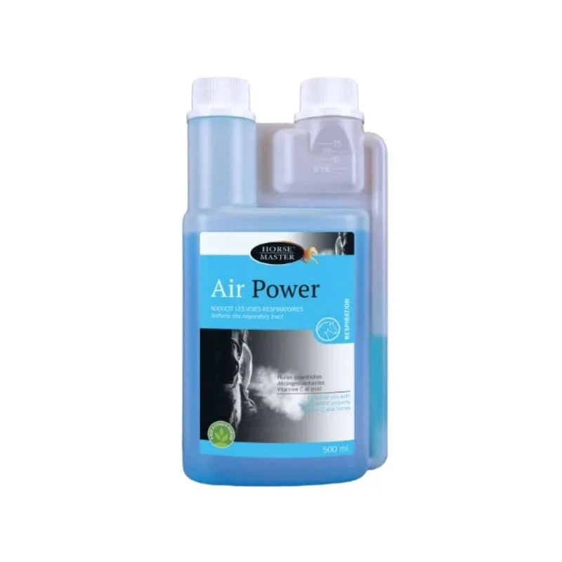 Les chevaux au travail ou vivant en box sont souvent sujets à des encombrements respiratoires légers ou des irritations dues à la poussière de foin et aux pollens. Le sirop Air Power de Horse Master est la solution rapide pour libérer le souffle. Sa formule liquide bleue, très appétente, agit rapidement pour procurer une sensation de fraîcheur et d'ouverture des naseaux.