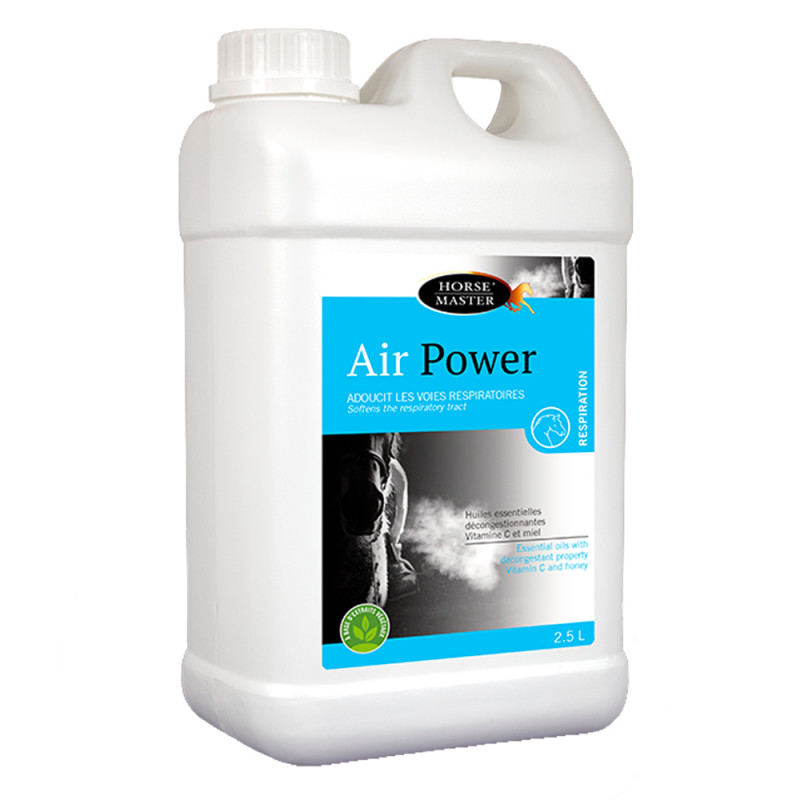 Air Power de Horse Master est un sirop apaisant conçu pour dégager les voies respiratoires du cheval. Formulé à base d'huiles essentielles (Menthol, Eucalyptus), de miel et de Vitamine C, il assure un soulagement immédiat en cas de toux d'irritation ou d'encombrement. Ce format de 2,5 Litres est idéal pour les écuries ou les cures de fond. Produit certifié Non Dopant (Logo NDS).
