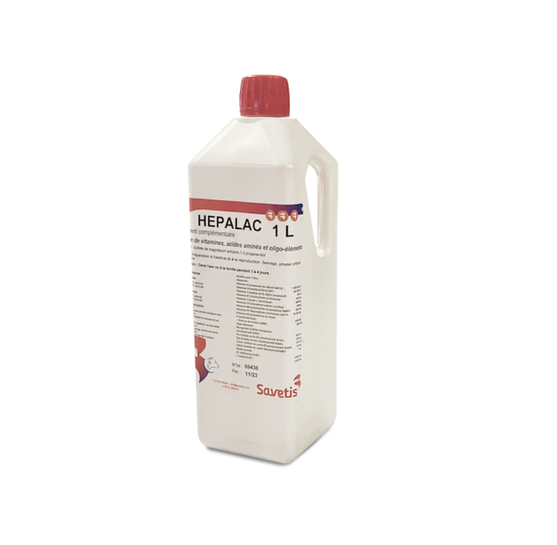 HEPALAC 1L est un complément diététique buvable polyvalent pour animaux de rente et de compagnie (bovins, ovins, caprins, porcins, équins, volailles, lapins). Sa formule complète, associant vitamines, oligo-éléments, acides aminés et niacine, est spécialement conçue pour soutenir l'organisme lors des phases de production intensive, de croissance rapide, ou en période de stress et de convalescence.
