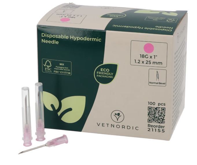 Le calibre 18G est sans doute le plus utilisé en pratique rurale. Moins traumatisant que le 16G mais offrant un débit supérieur aux aiguilles fines, le modèle VetNordic 1,2 x 25 mm est l'outil indispensable de la trousse vétérinaire pour les soins quotidiens.