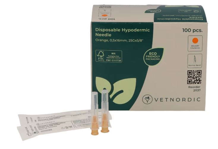 Les Aiguilles Hypodermiques 25G (0,5 x 16 mm), identifiables à leur embase orange, sont parmi les plus fines du marché vétérinaire standard.