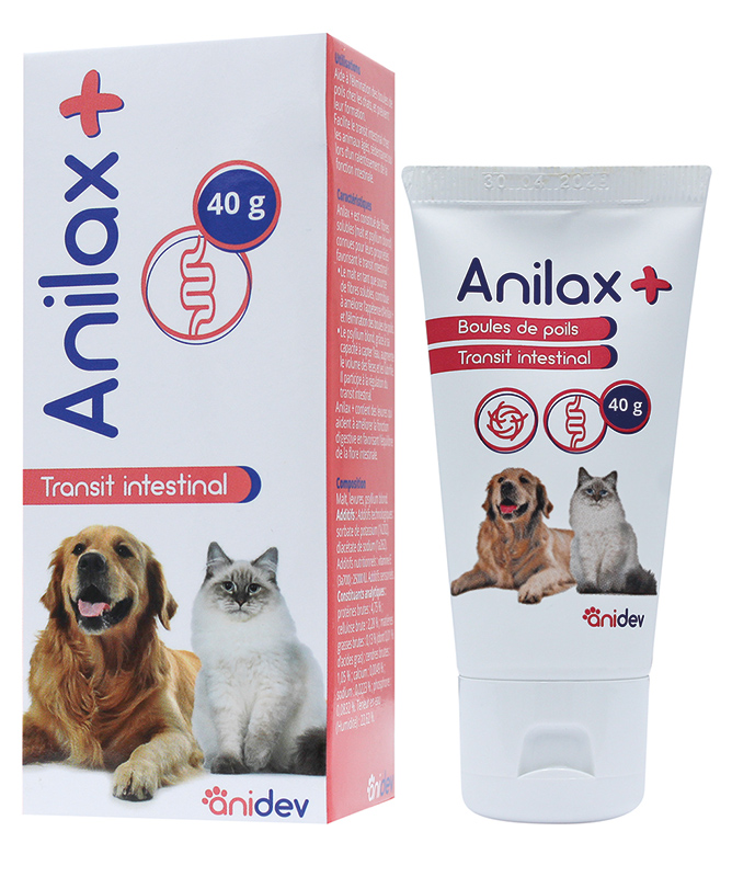 Anilax+ est un supplément nutritionnel sous forme de pâte orale destiné aux chiens et aux chats. Spécialement formulé pour lubrifier le tube digestif, il aide à l'élimination naturelle des boules de poils (trichobézoards) chez le chat et facilite le transit intestinal chez les animaux constipés ou sédentaires. Son format tube de 40g est pratique et son goût assure une prise facile.