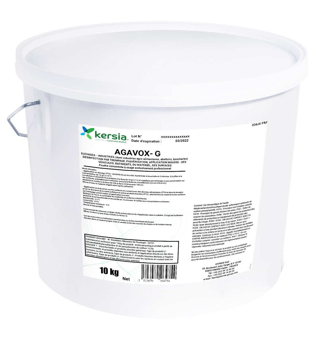 Agavox G est un désinfectant professionnel "tout-terrain" sous forme de poudre concentrée. Sa formule à l'acide peracétique offre une décontamination de haut niveau sur toutes les surfaces de l'élevage : sols, murs, équipements, mais aussi véhicules de transport. Certifié efficace contre les virus majeurs (Grippe Aviaire, Peste Porcine) et utilisable en Agriculture Biologique, c'est le produit unique pour sécuriser l'ensemble de votre exploitation.
