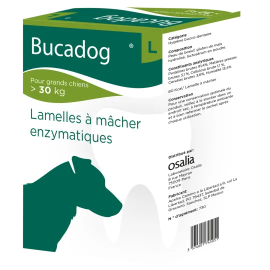 Les Lamelles à mâcher Bucadog L (Laboratoire Osalia) sont des friandises d'hygiène bucco-dentaire spécifiquement conçues pour les chiens de grande race (plus de 30 kg). Elles associent une texture ferme favorisant le nettoyage mécanique des dents à un complexe enzymatique naturel pour lutter contre la formation de la plaque dentaire et maintenir une haleine fraîche.