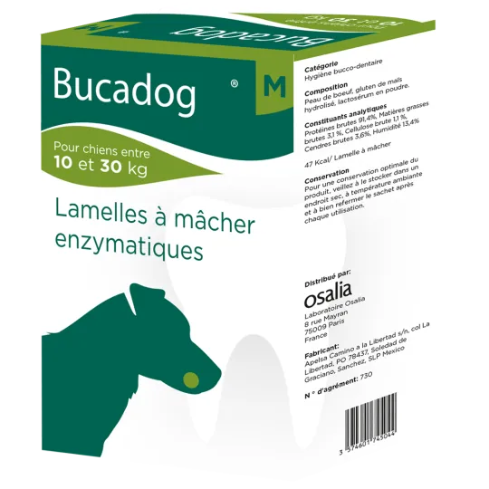 Combien y a-t-il de lamelles dans une boîte ? La boîte de Bucadog M (141 g) contient en moyenne 13 lamelles, ce qui correspond à environ deux semaines de traitement.