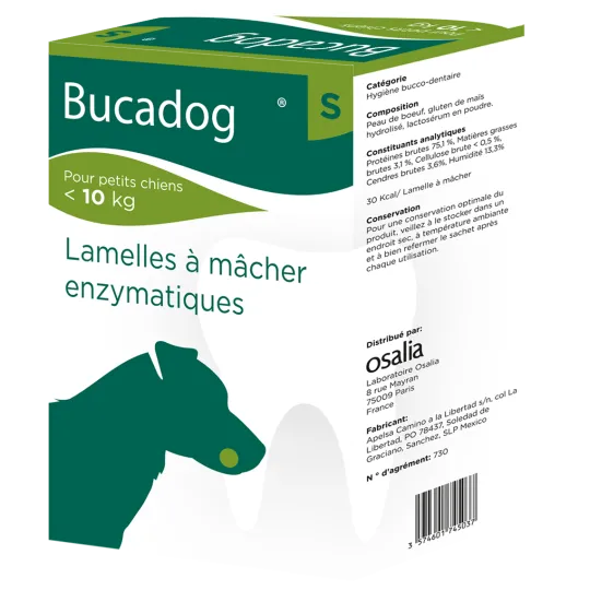 Les Lamelles Bucadog S sont des friandises d'hygiène bucco-dentaire conçues pour les chiens de moins de 10 kg. Grâce à un calibre adapté aux petites mâchoires et un complexe enzymatique unique, elles permettent de lutter efficacement contre la plaque dentaire et la mauvaise haleine tout en offrant une récompense saine.