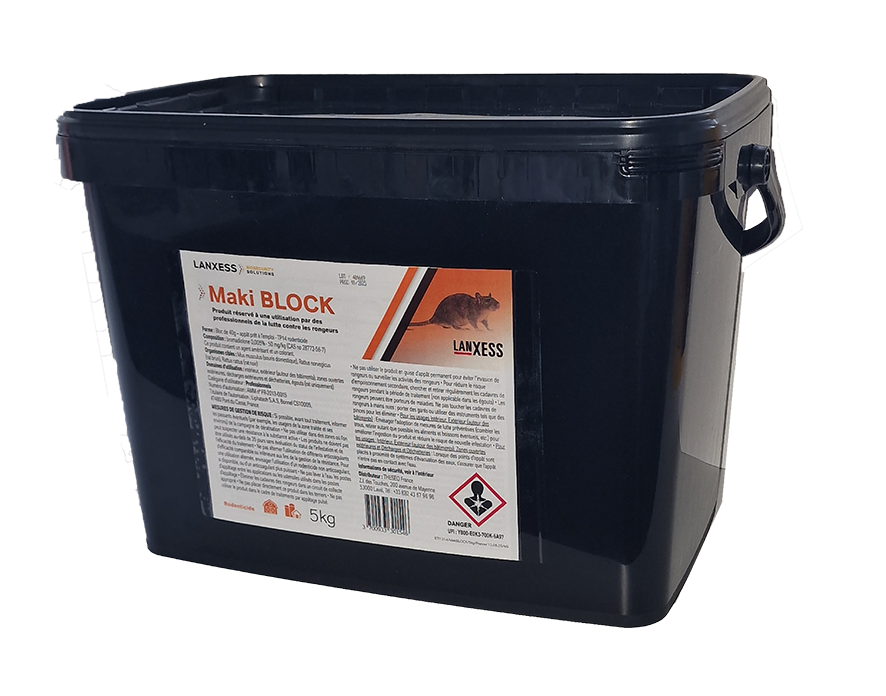 Lorsqu'il s'agit de dératiser des zones difficiles, humides ou soumises aux intempéries, les pâtes et les grains ne suffisent pas toujours. Le Maki BLOCK de Lanxess est formulé avec une base de paraffine alimentaire qui le rend insensible à l'eau et aux moisissures, tout en restant appétent pour les rongeurs.