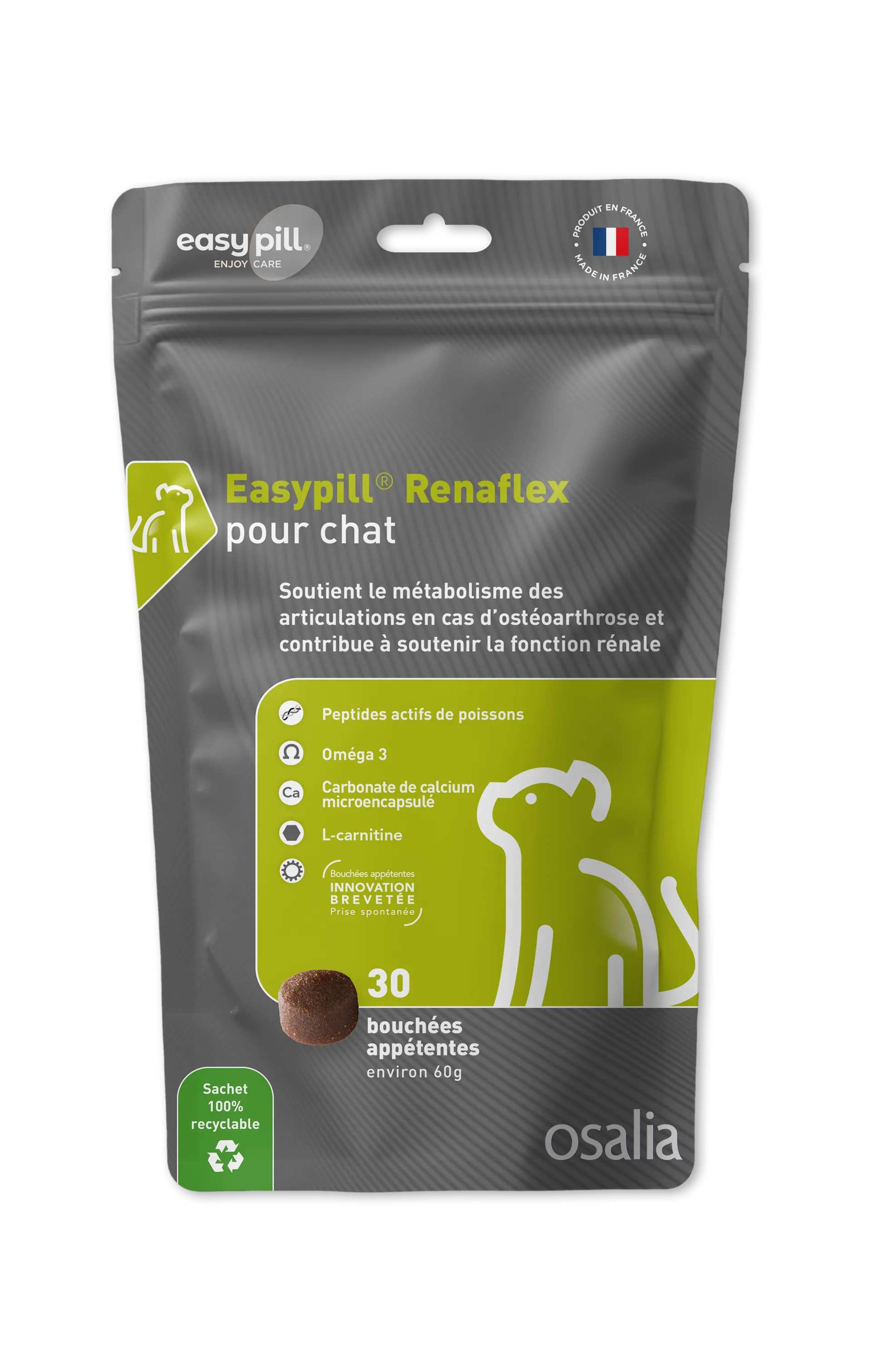 Avec l'âge, il n'est pas rare qu'un chat développe à la fois des douleurs articulaires (ostéoarthrose) et une insuffisance rénale. Gérer ces deux pathologies demande souvent de multiplier les compléments, ce qui peut être compliqué. Easypill Renaflex (Osalia) réunit le meilleur des deux mondes dans une seule bouchée appétente.