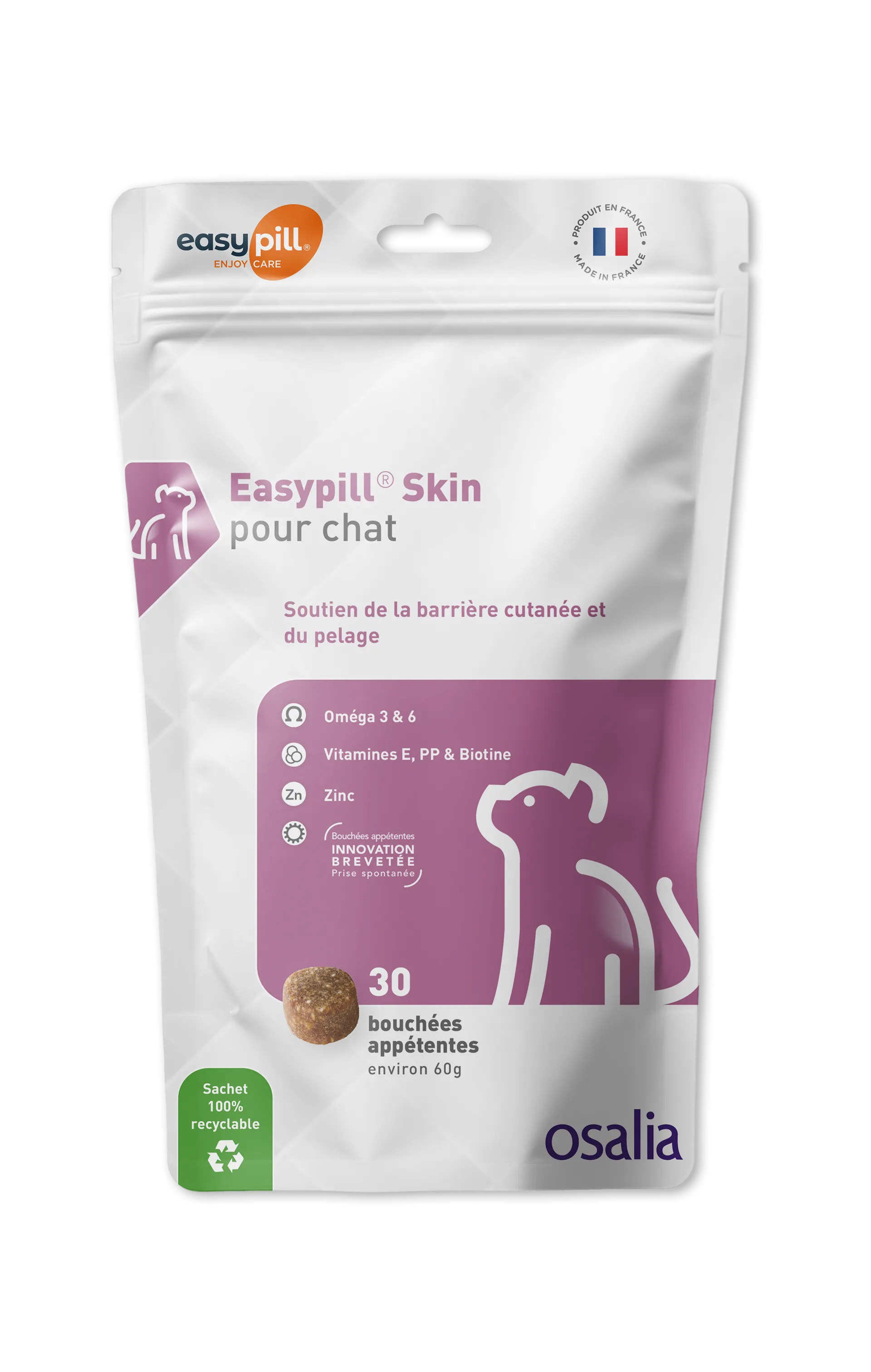 Easypill Skin est un aliment complémentaire dermatologique conçu pour redonner brillance et santé au pelage de votre chat. Grâce à sa formule riche en acides gras essentiels (Oméga 3 et 6) et en micronutriments (Biotine, Zinc), il renforce la barrière cutanée et limite la chute de poils, le tout sous forme d'une bouchée savoureuse.