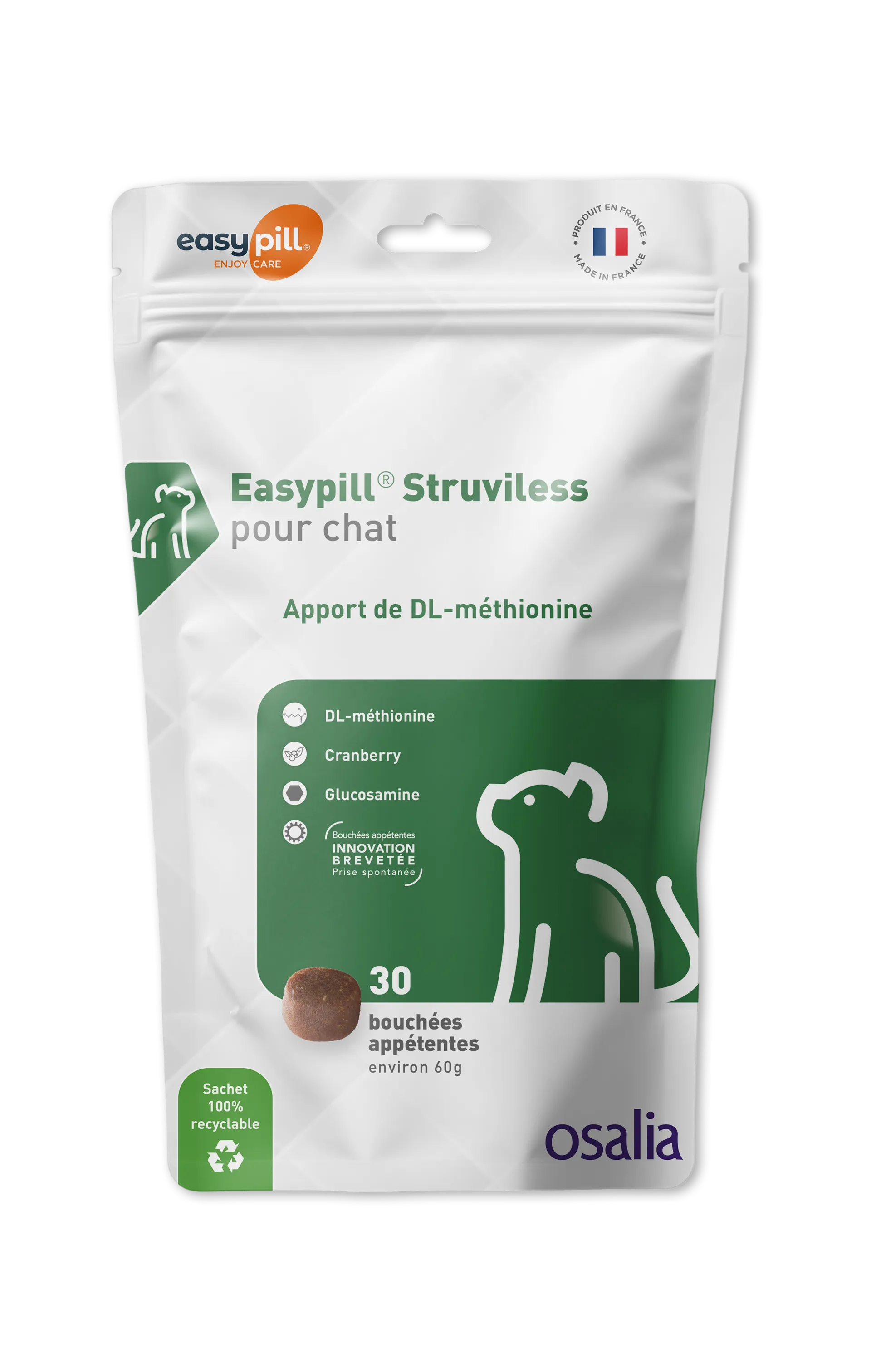 Easypill Struviless est un aliment complémentaire diététique conçu pour la gestion des calculs de struvite (phosphates ammoniaco-magnésiens) chez le chat. Grâce à son apport en DL-Méthionine, il aide à acidifier l'urine pour dissoudre les cristaux existants et prévenir leur réapparition, le tout dans une bouchée savoureuse facile à administrer.