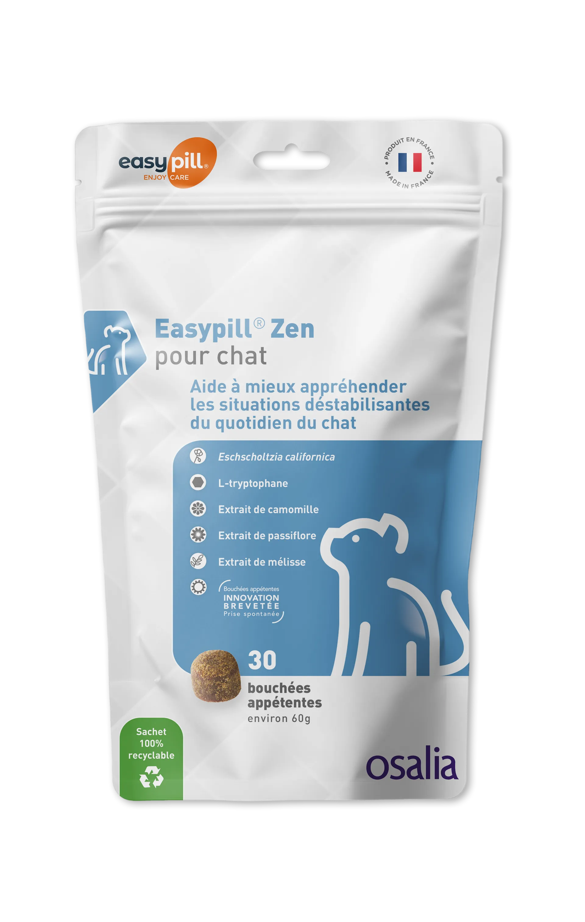 Easypill Zen est une solution naturelle pour aider votre chat à surmonter les situations déstabilisantes du quotidien. Grâce à une synergie unique de 4 plantes apaisantes (dont la Passiflore et la Mélisse) et de L-Tryptophane, ces bouchées savoureuses favorisent la relaxation sans endormir l'animal.