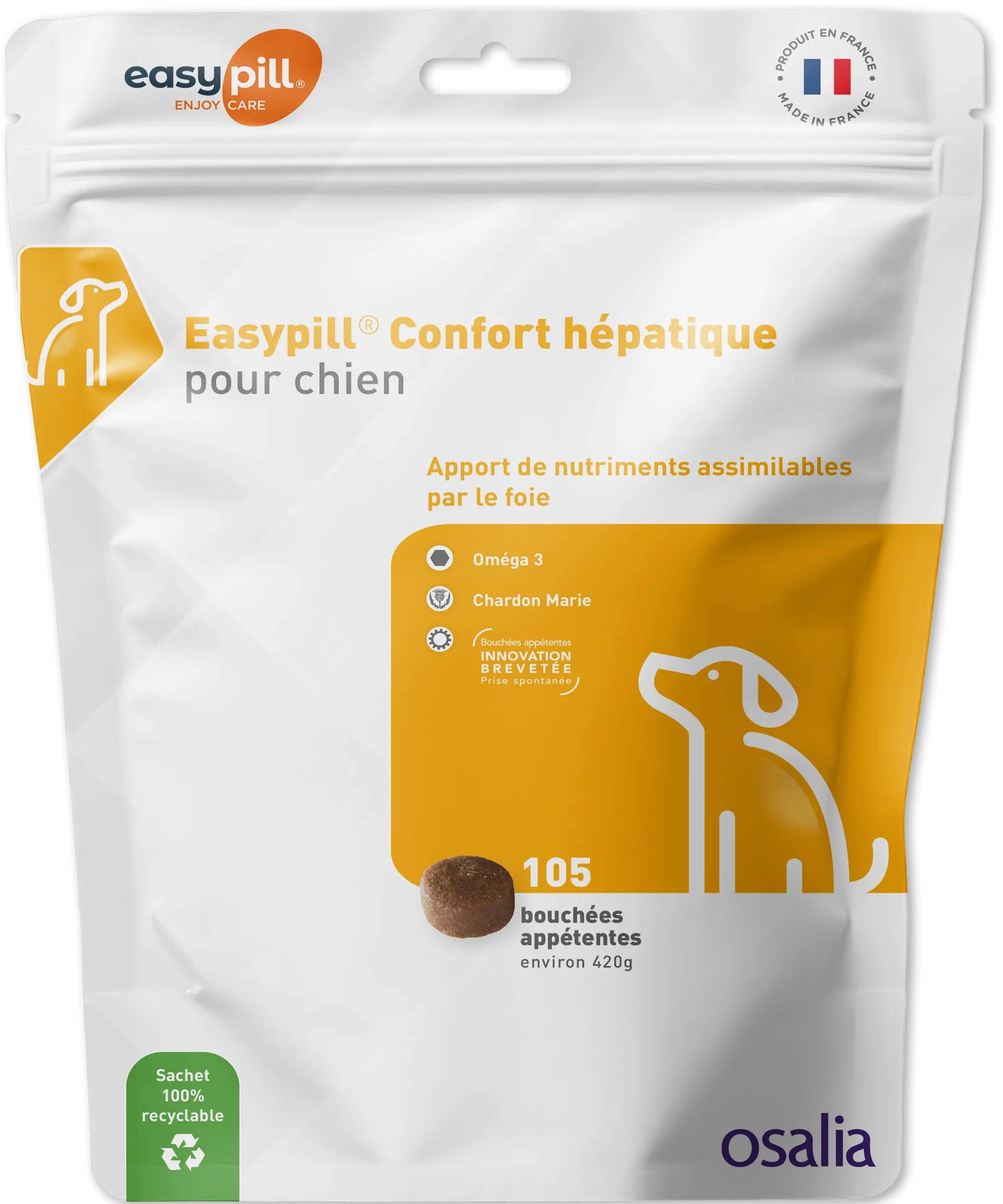 Easypill Confort Hépatique fait peau neuve ! L'ancienne boîte de barres laisse place à un sachet de 105 bouchées pré-dosées. Cet aliment complémentaire diététique reste la référence pour soutenir la fonction hépatique de votre chien. Sa formule riche en Chardon Marie et Oméga 3 aide à protéger et régénérer le foie, le tout dans une bouchée savoureuse facile à donner.