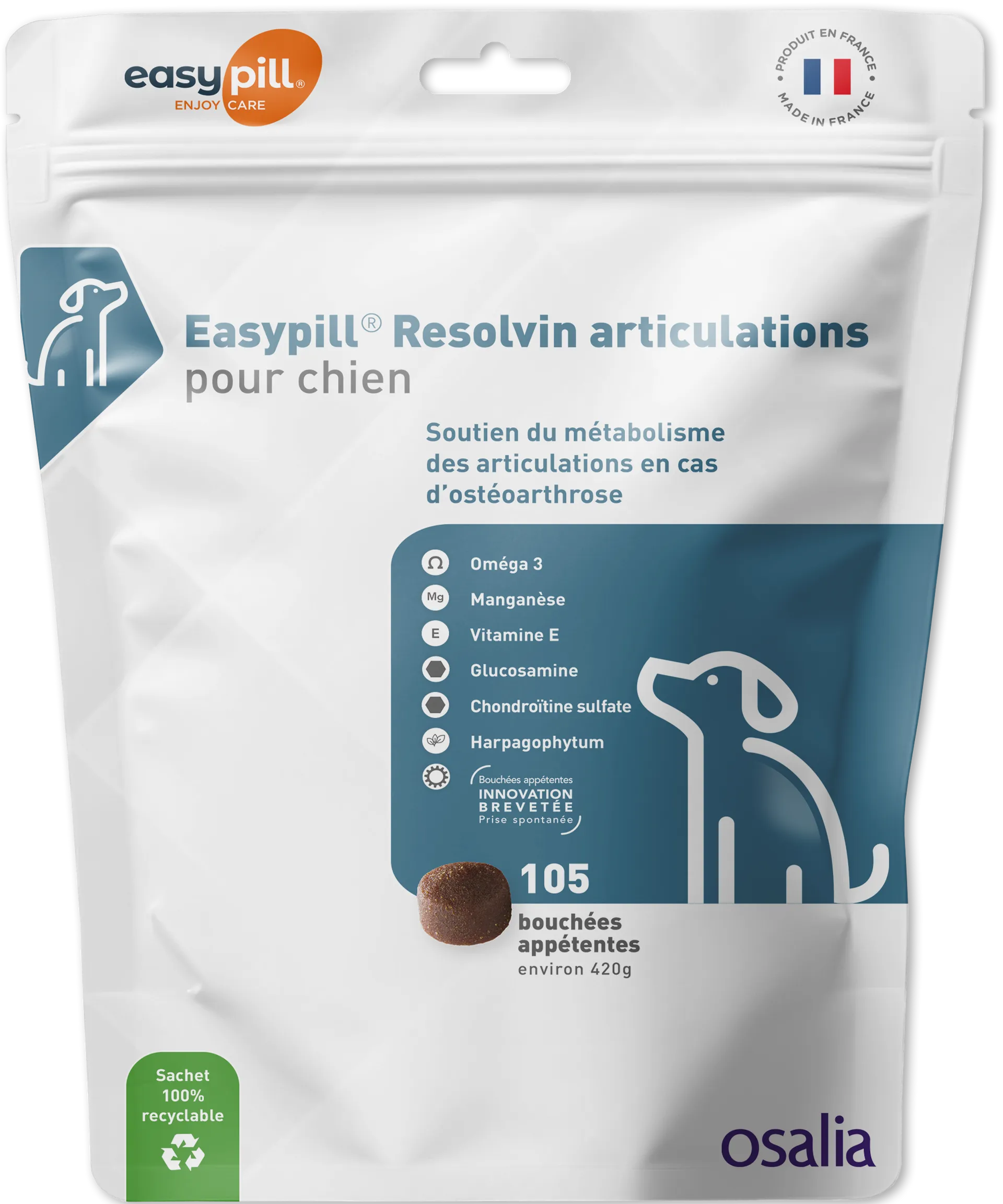 Ce supplément se présente sous forme de bouchées appétentes (souvent conditionnées en barres sécables). Grâce à la technologie Easypill, elles sont perçues comme une friandise par l'animal. Cela garantit une prise spontanée, rendant la cure de long terme agréable pour le chien et sans effort pour le propriétaire.