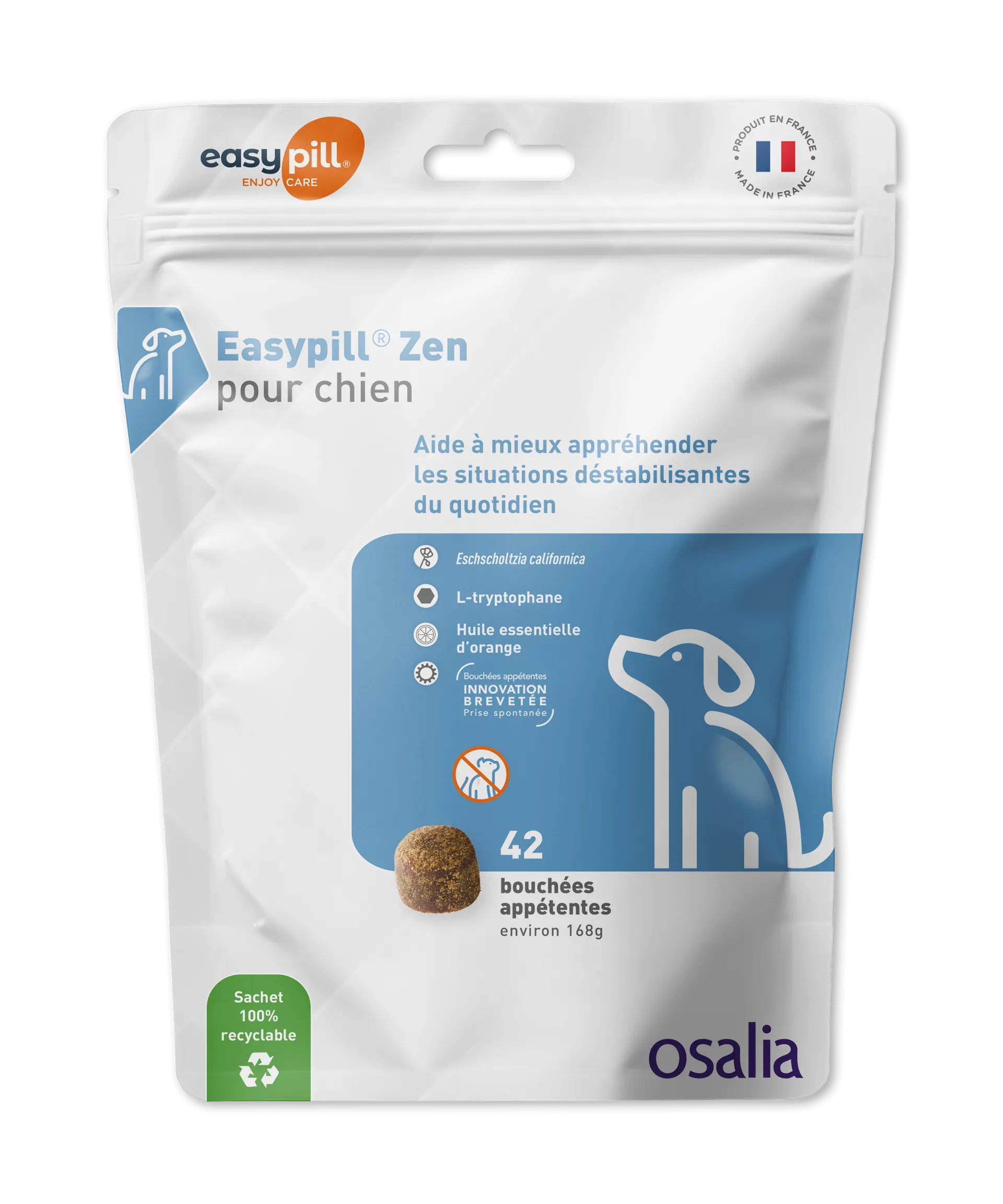 Easypill Zen est la solution douce et naturelle pour aider votre chien à mieux appréhender les situations déstabilisantes du quotidien (voyages, vétérinaire, orages, solitude). Sa formule unique associe des plantes apaisantes et des nutriments régulateurs de l'humeur pour favoriser la détente sans effet sédatif lourd. Présenté sous forme de bouchées tendres très appétences, il se donne facilement comme une récompense, même à un animal rendu difficile par le stress.