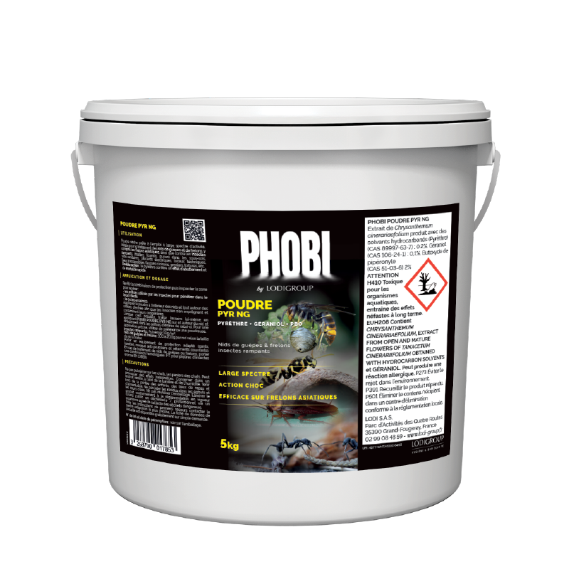 PHOBI Poudre PYR NG est un insecticide en poudre à action choc, conditionné en seau de 5 kg. Développé par Lodi Group, il est formulé à base de Pyrèthre naturel pour un effet d'abattement immédiat. Sa texture poudreuse le rend particulièrement efficace pour traiter les nids de guêpes et frelons (y compris asiatiques) ainsi que les insectes rampants (blattes, fourmis, puces) dans les lieux inaccessibles ou sensibles comme les placards électriques.