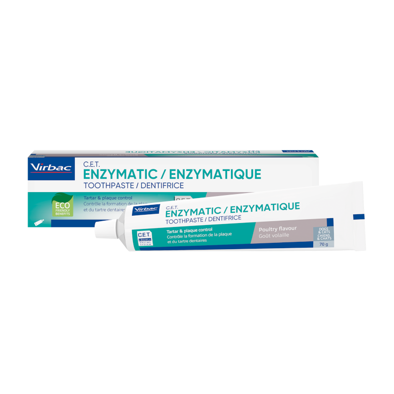 Le Dentifrice Enzymatique C.E.T. goût volaille de Virbac est spécialement conçu pour l’hygiène bucco-dentaire quotidienne des chiens et des chats.